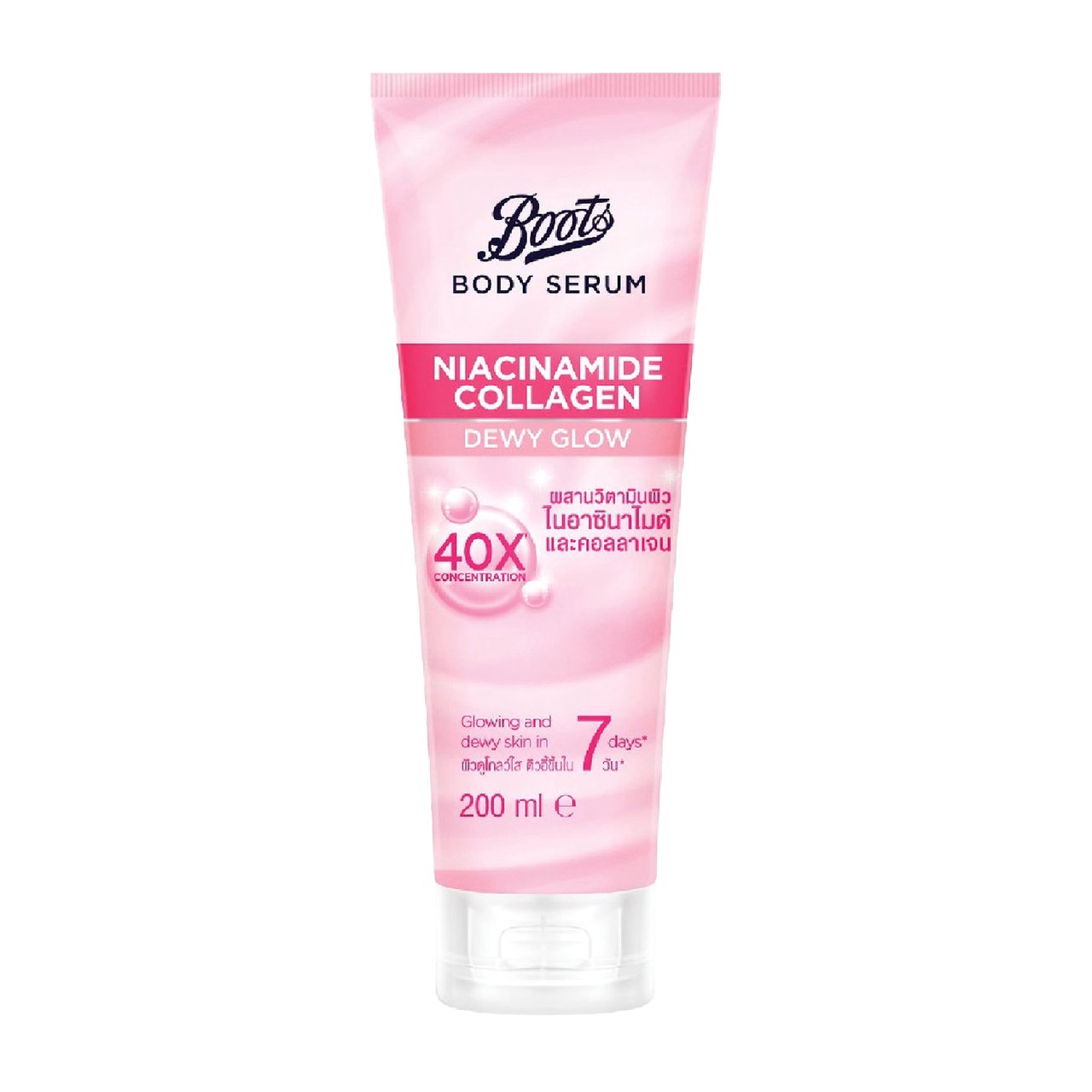BOOTS BODY SERUM NIACINAMIDE COLLAGEN DEWY GLOW NIACINAMIDE COLLAGEN DEWY GLOW Glowing and dewy skin in 7 days* Skincare innovation for your body, combining vitamins and proven skincare ingredients. This body serum contains 40X' Niacinamide and Collagen to nourish and reduce uneven skin tone visibly. Leaves your skin looking glowing and dewy in 7 days*. Directions: Gently massage body serum onto damp skin after bathing or whenever your skin feels dry. For best results, use this body serum twice a day. WARNINGS: 1. Do not apply to irritated or broken skin; discontinue use if rash develop. 2. Avoid direct contact into eyes. If product gets into the eyes rinse well with water immediately. 3. THIS IS NOT A FOOD. 4. Keep out of reach of children 5. Keep away from heat and direct sunlight. INGREDIENTS: Aqua (Water), Glycerin, C12-15 alkyl benzoate, Niacinamide, Tapioca starch, Cetearyl alcohol, Phenoxyethanol, Parfum (Fragrance), Ceteareth-20, Acrylates/C10-30 alkyl acrylate crosspolymer, Sodium stearoyl glutamate, Soluble collagen, Ethylhexylglycerin, Linalool, Limonene, Trisodium ethylenediamine disuccinate, Sodium hydroxide, PPG-2 methyl ether, Sodium chloride. Made in Thailand 200 ml e 'Compares concentration of Niacinamide with BOOTS TOMATO SHEET MASK. *Results from self-evaluation among 54 volunteers, at least 45 of them felt skin looked glowing and dewy in 7 days.
