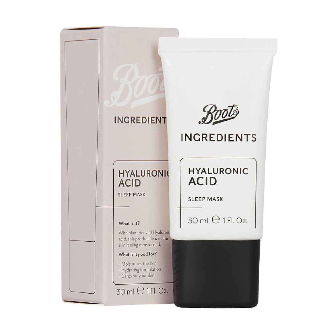 Boots Ingredients Hyaluronic Acid Sleep Mask 30Ml What is it? With plant derived Hyaluronic acid, this product leaves the skin feeling moisturised What is it good for? - Moisturises the skin - Hydrating formulation - Cares for your skin Vegan Not tested on animals How to use Apply a layer to the skin and gently massage until absorbed. Leave on overnight, do not rinse. Use 2-3 times a week. Hazards and Cautions "Keep out of the reach of children. If product gets into the eyes rinse well with water immediately Store in a cool dry place. Avoid direct sunlight"