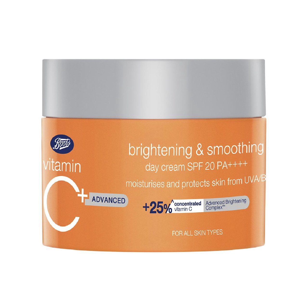 Boots Vitamin C Advanced Brightening & Smoothing Day Cream Spf20 Pa++++ 50 Ml We've lovingly formulated Boots Vitamin C Advanced brightening & smoothing day cream SPF20 PA++++ with +25% more concentrated vitamin c and advanced brightening complex helps nourish and protect skin from UVA/B while fading dull skin to reveal radiant and youthful-looking skin. Skin will look noticeably brighter and smoother. How to use : After serum, apply day cream evenly across face and neck. For better result, we recommend using this day cream with other Boots vitamin c advanced brightening & smoothing products
