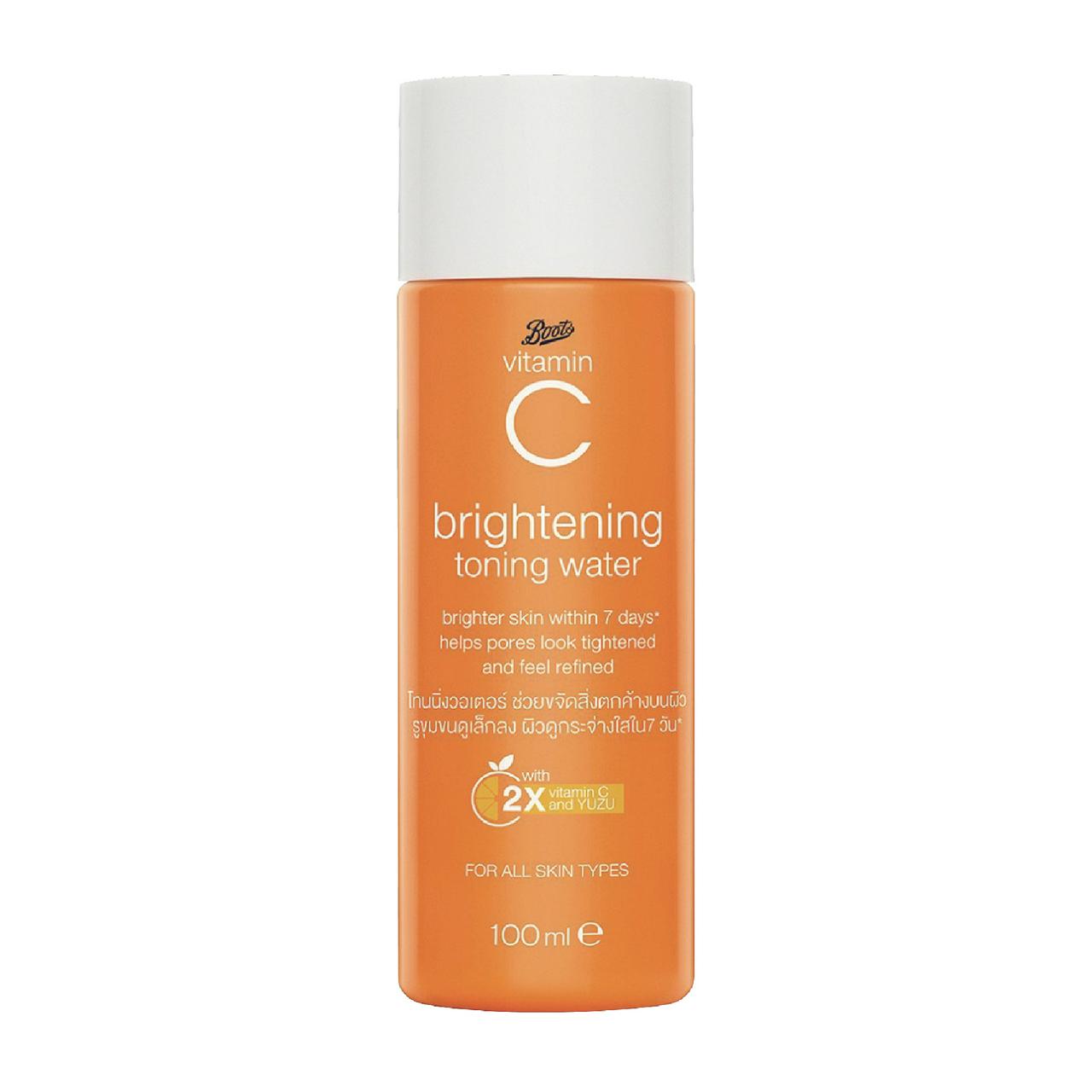 BOOTS VITAMIN C BRIGHTENING TONING WATER 100ML brighter skin within 7 days*helps pores look tightened and feel refined With 2x vitamin C** and Yuzu extract, this alcohol-free toning water helps reduce residue on skin for tightened-looking and refined-feeling pores. Skin looks brighter within 7 days. Suitable for all skin types. Here's how to use: After cleansing. Sweep over cleansed skin with cotton pad. Warnings: 1. Do not apply to irritated or broken skin; discontinue use if rash develops. 2. Avoid direct contact with eyes. If product gets into the eyes rinse well with water immidiately. 3. Do not swallow. 4. Keep out of reach of children. 5. Keep away from heat and direct sunlight. *Results from self-evaluation among 107 vilunteers, 82 of them feel that skin looks brighter within 7 days. **3-O-Ethyl Ascorbic Acid, Ascorbyl Tetraisopalmitate