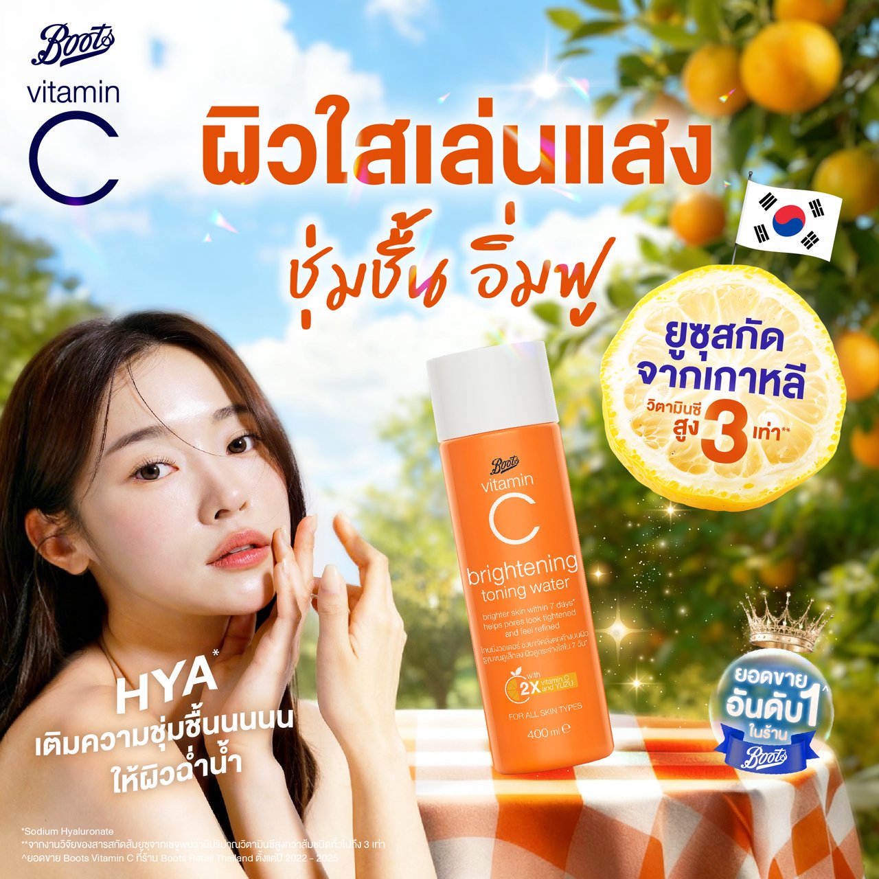 BOOTS VITAMIN C BRIGHTENING TONING WATER 400ML brighter skin within 7 days*helps pores look tightened and feel refined With 2x vitamin C** and Yuzu extract, this alcohol-free toning water helps reduce residue on skin for tightened-looking and refined-feeling pores. Skin looks brighter within 7 days. Suitable for all skin types. Here's how to use: After cleansing. Sweep over cleansed skin with cotton pad. Keep product away from heat and direct sunlight. Warnings: 1. Avoid direct contact with eyes. If product gets into the eyes rinse well with water immeduately. 2. This is not food. Keep out of reach of children. Precaution : Do not apply to irritated or broken skin; Discountinue use if rash develops. *Results from self-evaluation among 107 vilunteers, 82 of them feel that skin looks brighter within 7 days. **3-O-Ethyl Ascorbic Acid, Ascorbyl Tetraisopalmitate
