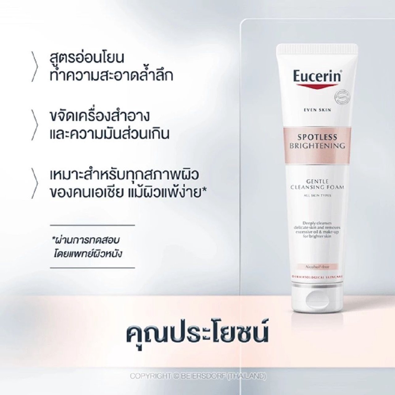 EUCERIN SPOTLESS BRIGHTENING GENTLE CLEANSING FOAM Deep cleansing withgentle formula, Contains Dio ACTIVE, an effective but gentle ingredient which has proven effects on reducing pigmentation discoloration. The product refreshes and revitalises the skin effectively, and takes the shine off the T-zone. The formula has been specially developed for the needs of delicate Asian skin. Thus it only contains of well selected ingredients and is free of alcohol and colourants.remove cosmetics and excessive oil on T-Zone for a brighter skin. Dermatological tested. Suitable for all asian akin typesevensensitive skin.