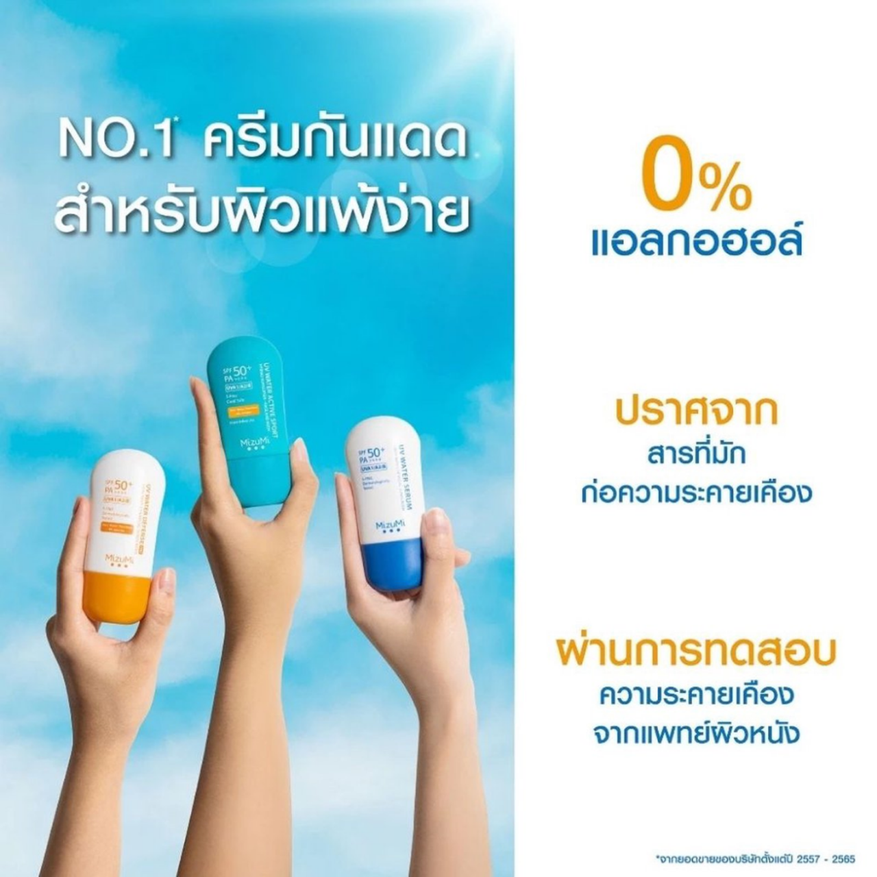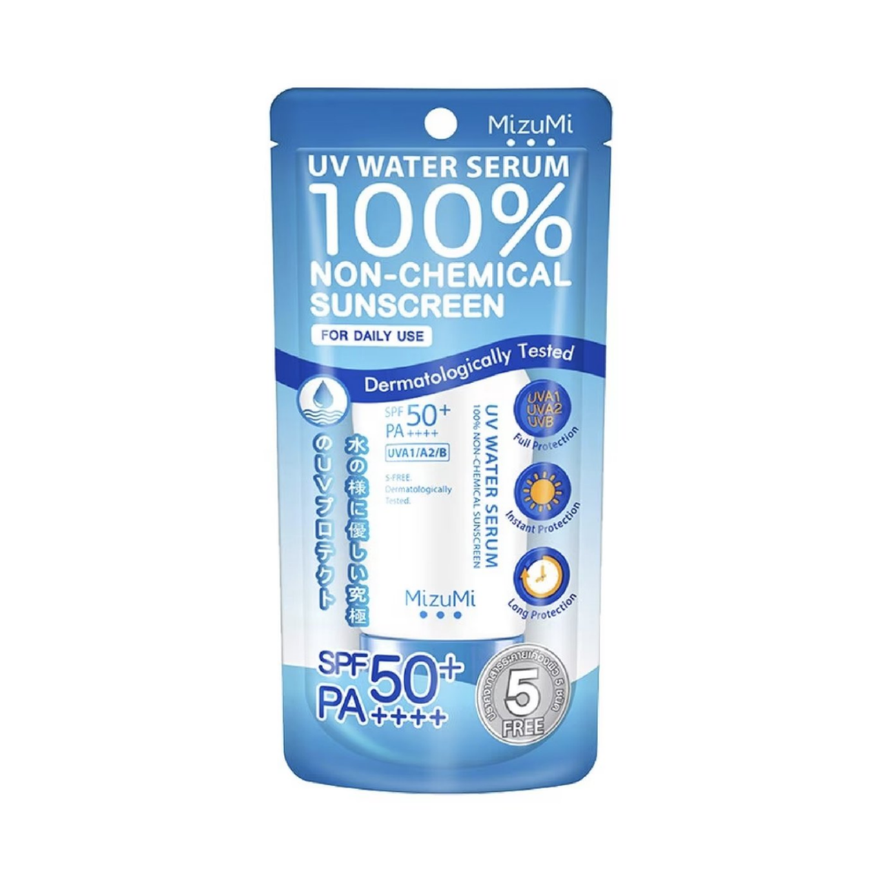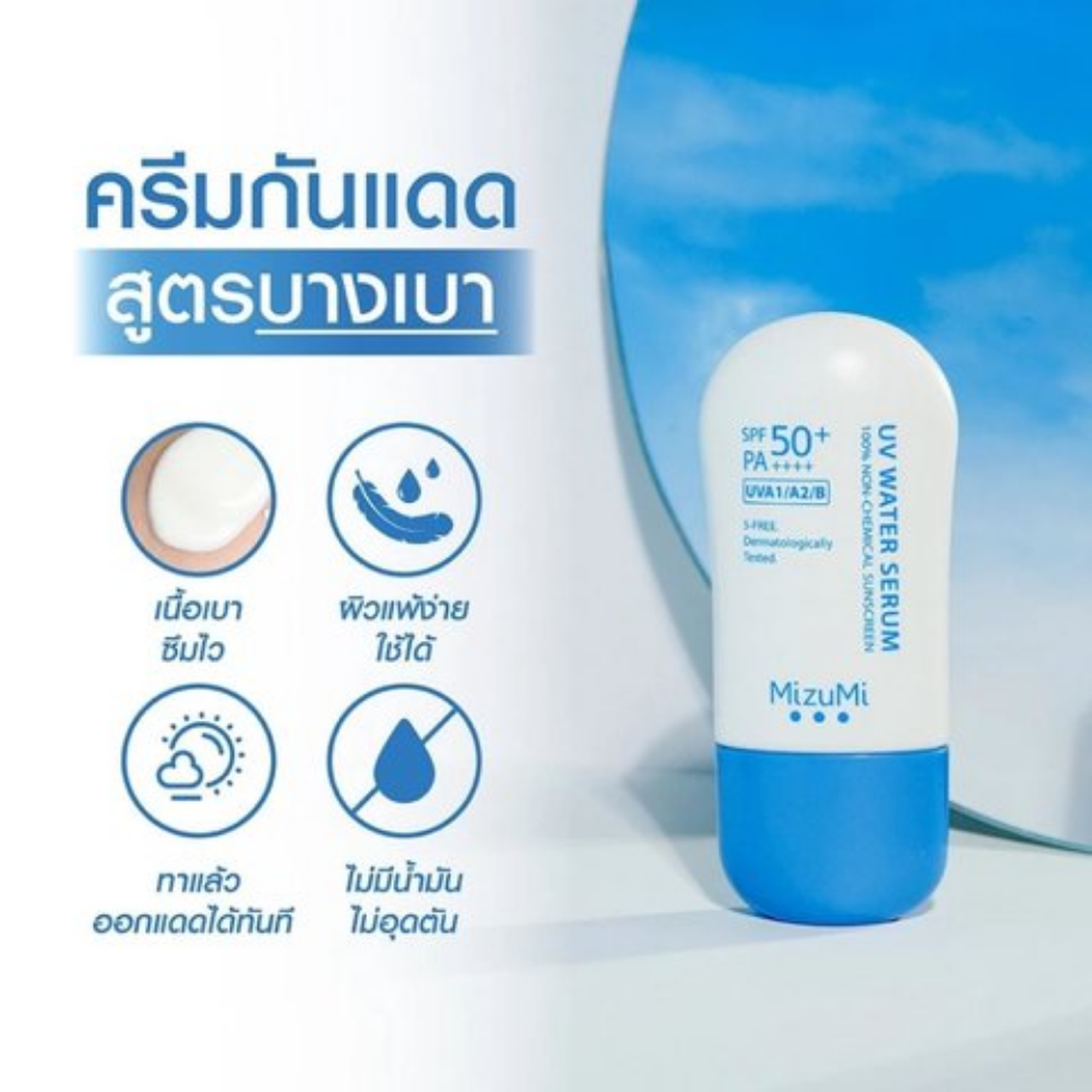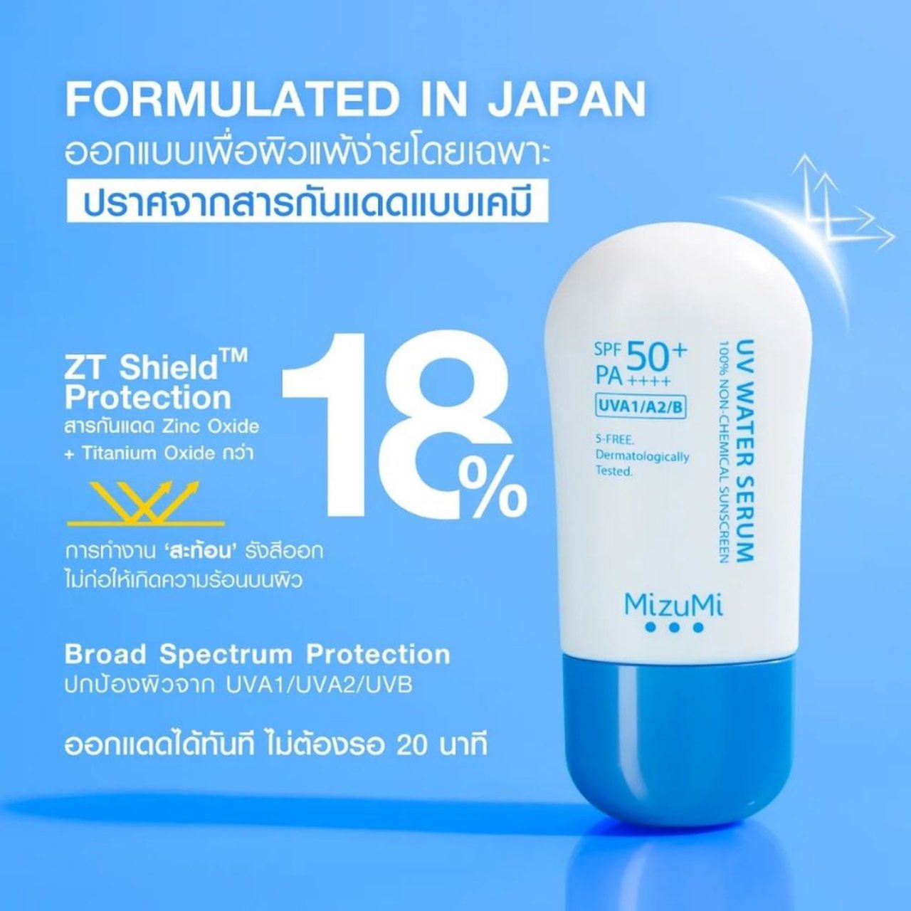 Mizumi UV Water Serum SPF50+/PA++++ 40g Water-based sunscreen for sensitive skin, maximum protection but gentle as water from Mizumi, blue tube for daily use. light texture non sticky Does not leave stains after setting reflects the rays UVA1/UVA2/UVB from the skin and can be used by everyone in the family.