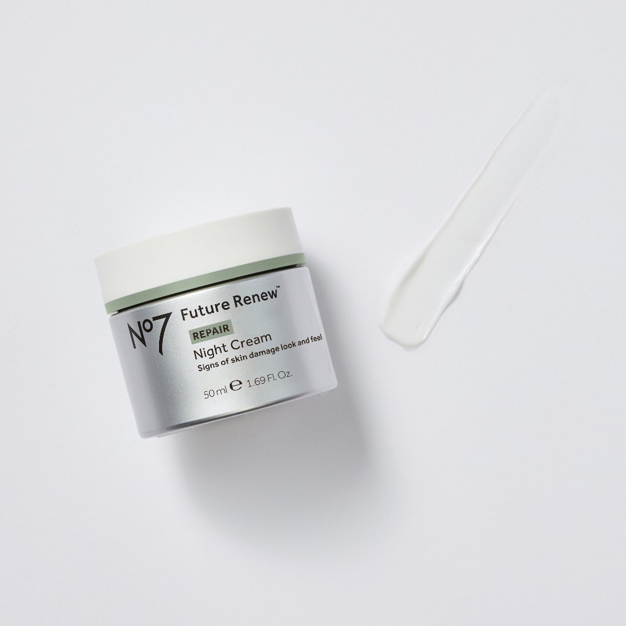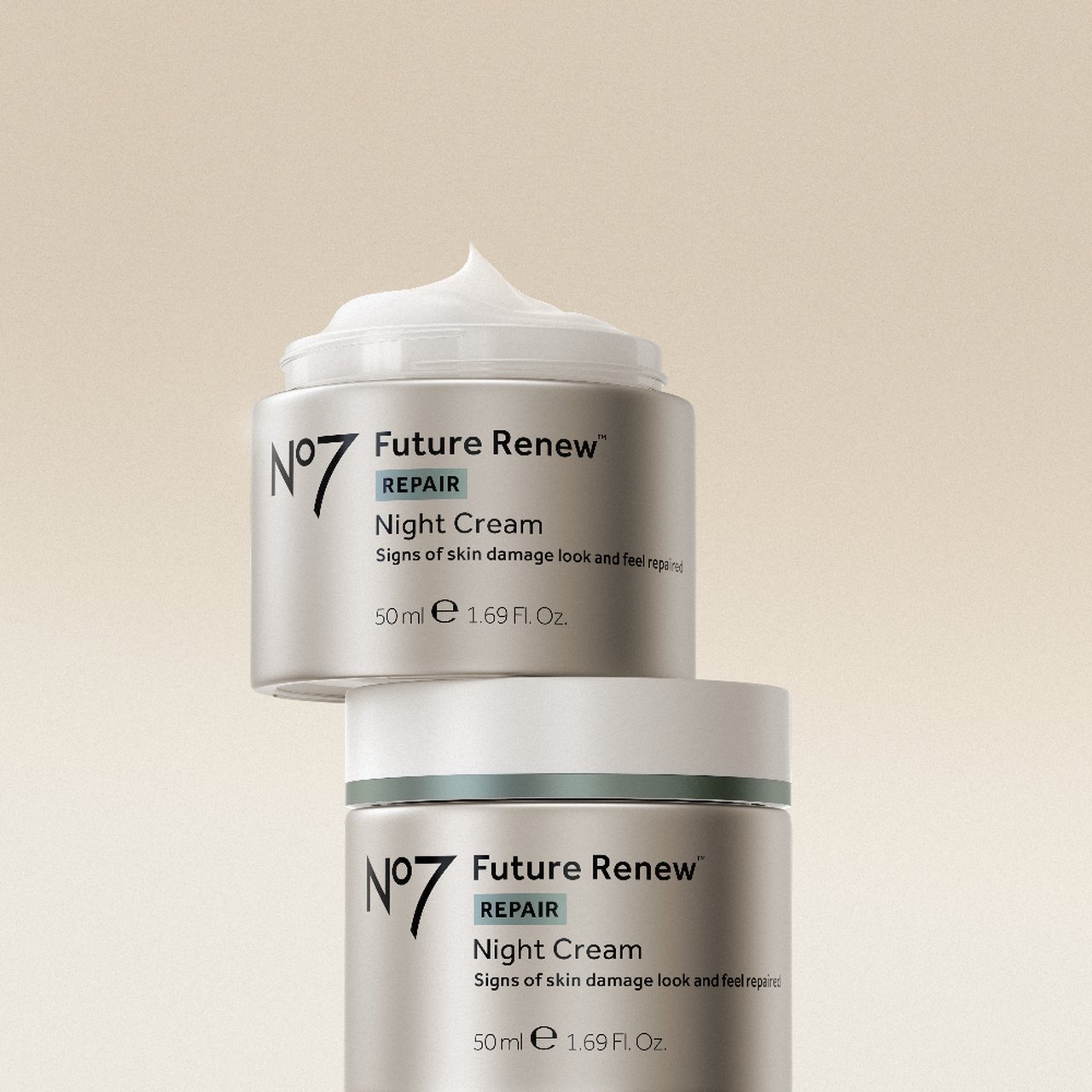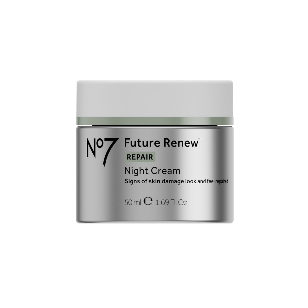 No7 Future Renew Repair Night Cream 50 ML. NEW No7 Future Renew? Night Cream is expertly developed to reverse visible signs of skin damage while you sleep. The ability for our skin to repair itself while we sleep decreases as we age. This night cream is expertly formulated to support skin's natural self-repair process while sleeping and repair visible signs of skin damage, such as the appearance of uneven tone and texture, dry skin and lost elasticity. It is powered by Pepticology?, No7's new and patent-pending peptide technology, developed over the course of 15 years by world-leading scientists. Exclusive to No7's Future Renew? range, this cutting edge techonology supports the skin's natural self-repair process. * SKIN DAMAGE: Proven to repair visible signs of skin damage while you sleep. * REVERSES the appearance of uneven tone and texture, dry skin and lost elasticity. * DEEPLY MOISTURISES: Skin feels moisturised instantly and for up to 72 hours. 82% of women said they had experienced a reversal in the feeling of skin dryness* (*User Trial of 250 UK women in 2022) * INSTANT RESULTS: From the first use, skin feels nourished, softer and smoother. * WAKE UP TO firmer feeling and brighter looking skin. * RESULTS IN 1 WEEK: After one week of use, skin feels supple and skin texture looks more even. * BACKED BY EXPERTS: This formulation is Dermatologist Approved and contains technology developed by world-leading scientists * LIGHTWEIGHT TEXTURE: This indulgent cream absorbs quickly into skin, without leaving a sticky residue How to use : Use every evening, massage in small upward circles over your face & neck. WARNINGS: Avoid contact with eyes. If product gets into the eyes rinse well with water. Ingredients: Aqua (Water), Glycerin, Butyrospermum parkii (Shea) butter, Sorbitan stearate, Dimethicone, Cetearyl alcohol, Caprylic/capric triglyceride, Niacinamide, Ethylhexyl stearate, Polyacrylamide, C13-14 isoparaffin, Tocopheryl acetate, Panthenol, Phenoxyethanol, Dimethiconol, Parfum (Fragrance), Tribehenin, Dipropylene glycol, Sucrose cocoate, Methylparaben, Laureth-7, Carbomer, Sodium hyaluronate, Ethylparaben, Hydrolyzed rice protein, Propylene glycol, Ascorbyl glucoside, Xanthan gum, Tetrasodium EDTA, Potassium hydroxide, Propanediol, Pentylene glycol, Decyl glucoside, Sodium benzoate, Morus alba leaf extract, Lindera strychnifolia root extract, Ethylhexylglycerin, Palmitoyl tetrapeptide-94, Palmitoyl tetrapeptide-95.