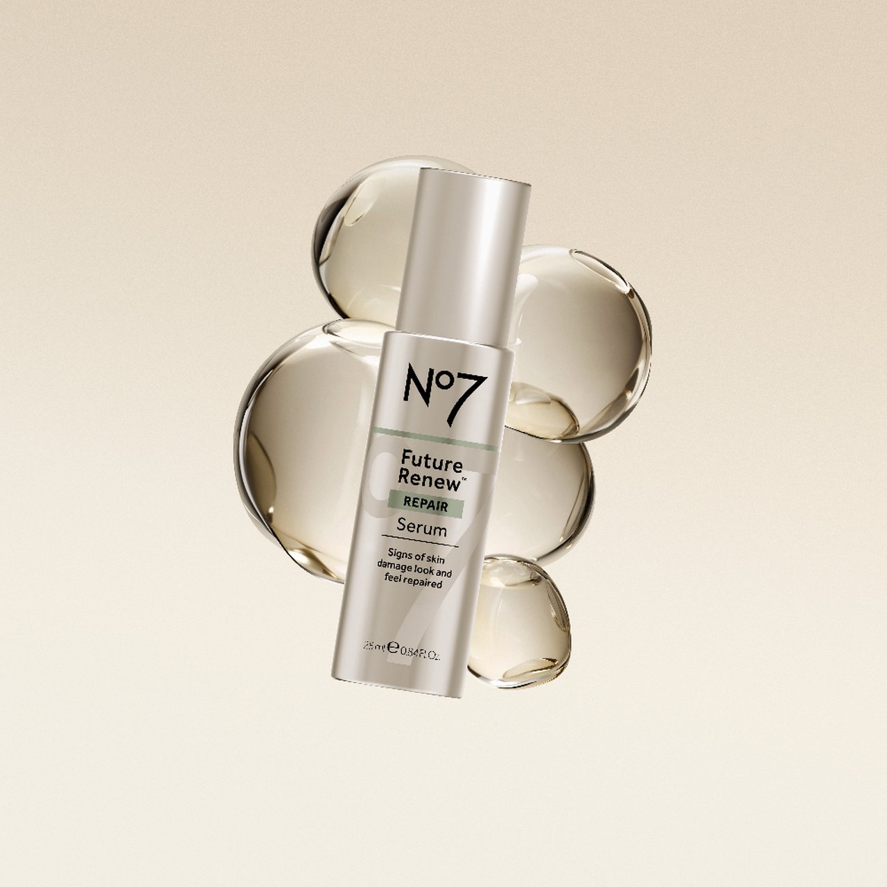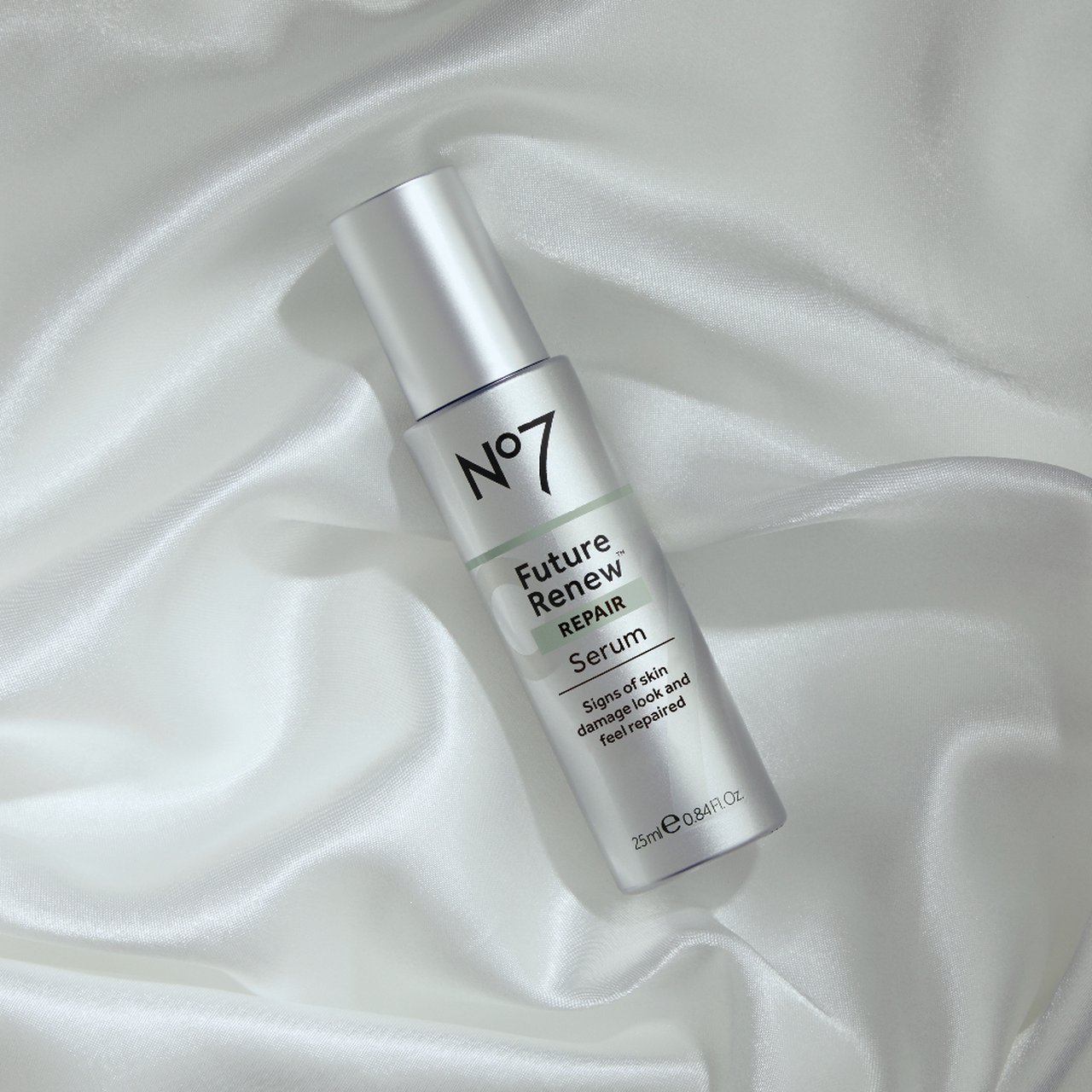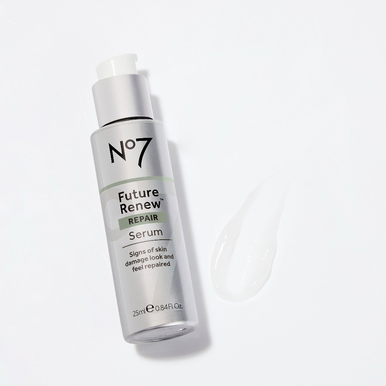 No7 Future Renew Repair Serum 25 ML. Reverse visible signs of skin damage in just 4 weeks with NEW No7 Future Renew? Serum, supercharged with Pepticology?, a world-first in peptide technology. Over time, damage that has developed under the skin becomes increasingly visible. This serum is expertly developed to reverse visible signs of skin damage, such as the appearance of fine lines and wrinkles, uneven tone and texture, dry skin and the feeling of lost elasticity. It is powered by Pepticology?, No7's new and patent-pending peptide technology, developed over the course of 15 years by world-leading scientists. Exclusive to No7's Future Renew? range, this cutting edge techonology supports the skin's natural self-repair process. * SKIN DAMAGE: 75% women said their skin felt less damaged* (*Consumer studies) * INSTANT RESULTS: From the first use, skin looks brighter and feels hydrated, renewed and firmer. * RESULTS IN 1 WEEK: After one week of use, skin tone and texture looks more even, the appearance of dryness is improved and fine lines appear plumped. * BACKED BY EXPERTS: This formulation is Dermatologist Approved and contains technology developed by world-leading scientists. * LIGHTWEIGHT TEXTURE: A fast-absorbing, non-greasy serum that works well under makeup. How to use : Use morning and evening after cleansing. Apply evenly over your face and neck, then follow with your No7 Day or Night cream. WARNINGS: Avoid contact with eyes. If product gets into the eyes rinse well with water. Ingredients: Aqua (Water), Dimethicone, Butylene glycol, Glycerin, Methyl gluceth-20, Isononyl isononanoate, Polysilicone-11, Niacinamide, Phenoxyethanol, Acrylates/beheneth-25 methacrylate copolymer, Tocopheryl acetate, Silica, Panthenol, Polysorbate 20, Caprylyl glycol, Ammonium acryloyldimethyltaurate/VP copolymer, Potassium hydroxide, Xanthan gum, Sodium hyaluronate, Hydrolyzed rice protein, Decyl glucoside, Propylene glycol, Ethylhexylglycerin, Ascorbyl glucoside, Propanediol, Pentylene glycol, Tetrasodium EDTA, Hexylene glycol, T-butyl alcohol, Sodium benzoate, Morus alba leaf extract, Palmitoyl tetrapeptide-94, Palmitoyl tetrapeptide-95.