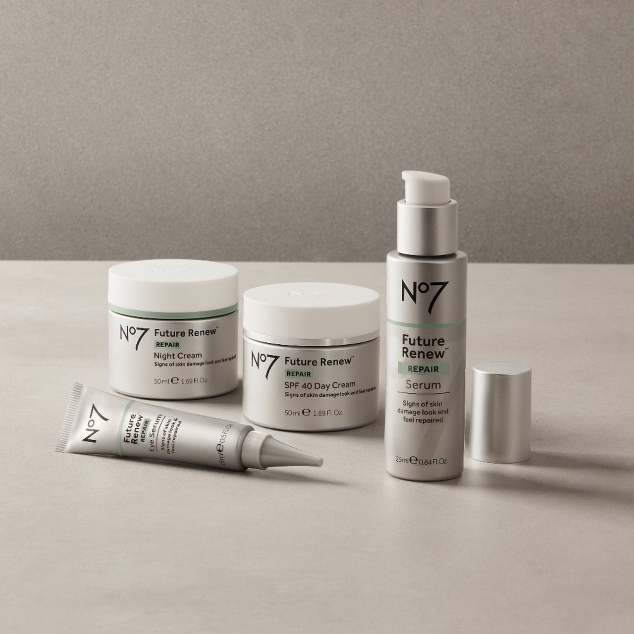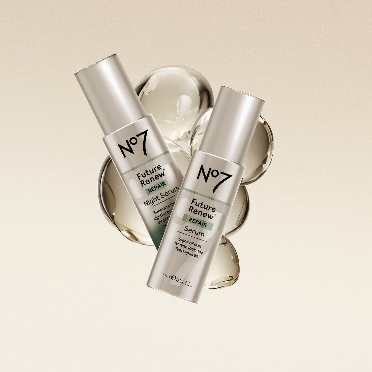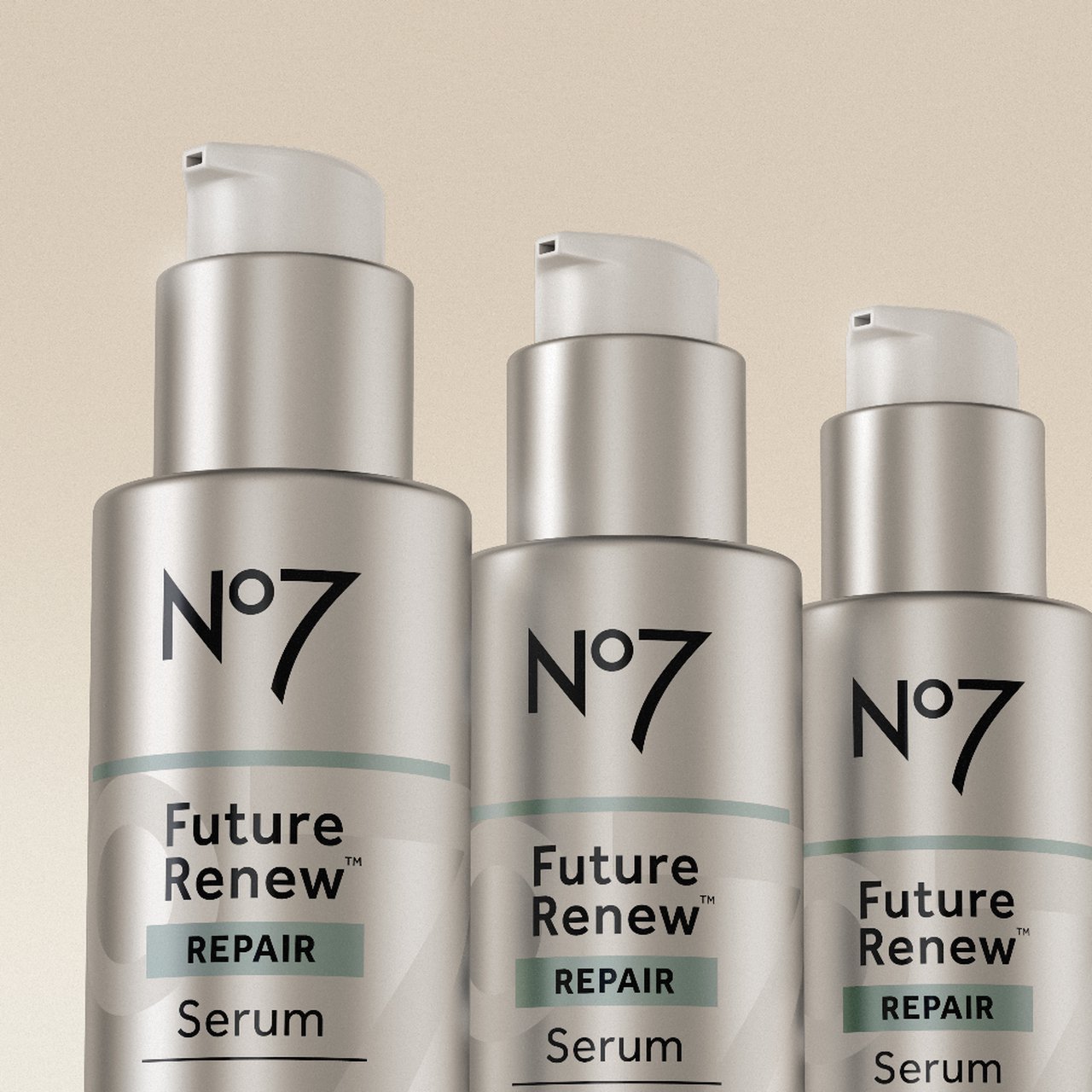 No7 Future Renew Repair Serum 25 ML. Reverse visible signs of skin damage in just 4 weeks with NEW No7 Future Renew? Serum, supercharged with Pepticology?, a world-first in peptide technology. Over time, damage that has developed under the skin becomes increasingly visible. This serum is expertly developed to reverse visible signs of skin damage, such as the appearance of fine lines and wrinkles, uneven tone and texture, dry skin and the feeling of lost elasticity. It is powered by Pepticology?, No7's new and patent-pending peptide technology, developed over the course of 15 years by world-leading scientists. Exclusive to No7's Future Renew? range, this cutting edge techonology supports the skin's natural self-repair process. * SKIN DAMAGE: 75% women said their skin felt less damaged* (*Consumer studies) * INSTANT RESULTS: From the first use, skin looks brighter and feels hydrated, renewed and firmer. * RESULTS IN 1 WEEK: After one week of use, skin tone and texture looks more even, the appearance of dryness is improved and fine lines appear plumped. * BACKED BY EXPERTS: This formulation is Dermatologist Approved and contains technology developed by world-leading scientists. * LIGHTWEIGHT TEXTURE: A fast-absorbing, non-greasy serum that works well under makeup. How to use : Use morning and evening after cleansing. Apply evenly over your face and neck, then follow with your No7 Day or Night cream. WARNINGS: Avoid contact with eyes. If product gets into the eyes rinse well with water. Ingredients: Aqua (Water), Dimethicone, Butylene glycol, Glycerin, Methyl gluceth-20, Isononyl isononanoate, Polysilicone-11, Niacinamide, Phenoxyethanol, Acrylates/beheneth-25 methacrylate copolymer, Tocopheryl acetate, Silica, Panthenol, Polysorbate 20, Caprylyl glycol, Ammonium acryloyldimethyltaurate/VP copolymer, Potassium hydroxide, Xanthan gum, Sodium hyaluronate, Hydrolyzed rice protein, Decyl glucoside, Propylene glycol, Ethylhexylglycerin, Ascorbyl glucoside, Propanediol, Pentylene glycol, Tetrasodium EDTA, Hexylene glycol, T-butyl alcohol, Sodium benzoate, Morus alba leaf extract, Palmitoyl tetrapeptide-94, Palmitoyl tetrapeptide-95.