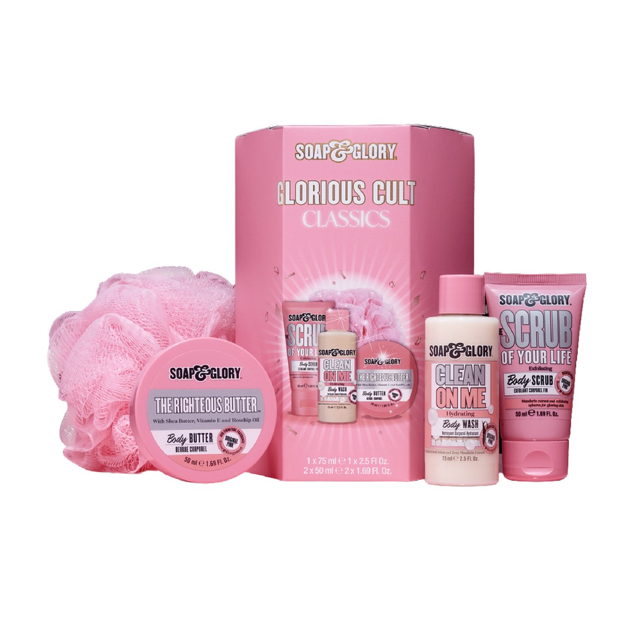 SOAP & GLORY GLORIOUS CULT CLASSICS (Set) 1.SOAP & GLORY THE RIGHTEOUS BUTTER BODY BUTTER 50ml. How to Use: After cleaning the body Apply the product all over the body. while the skin is damp to increase moisture Should be used regularly both morning and evening. Ingredients: Aqua (Water/Eau), Butyrospermum Parkii (Shea) Butter, Glycerin, Cetearyl Alcohol, Cocos Nucifera (Coconut) Oil, Glyceryl Stearate, PEG-100 Stearate, Theobroma Cacao (Cocoa) Seed Butter, Parfum (Fragrance), Dimethicone, Phenoxyethanol, Rosa Canina Fruit Extract, Caprylyl Glycol, Isopropyl Myristate, Carbomer, Hexyl Cinnamal, Ethylhexylglycerin, Tocopheryl Acetate, Hydroxyethylcellulose, Limonene, Potassium Hydroxide, BHT, Tetrasodium EDTA, Linalool, Benzyl Salicylate, Geraniol, Glyceryl Acrylate/Acrylic Acid Copolymer, Citric Acid, Benzyl Alcohol, Alpha-Isomethyl Ionone, Citral, Disodium Phosphate, Citronellol, Sodium Hydroxide, Sodium Phosphate.— Made in the UK. *Please refer to product label WARNING: If you get it in your eyes, rinse immediately with clean water. 2.SOAP & GLORY CLEAN ON ME HYDRATING BODY WASH 75ml. How to Use: Pour the bath product onto your palm or sponge. Apply all over the body until foam forms, then rinse off. Use regularly both morning and evening. Ingredients: Aqua (Water/Eau), Ammonium Lauryl Sulfate, Glycol Distearate, Parfum (Fragrance), Sodium Laureth Sulfate, PEG-4 Rapeseedamide, Glycerin, Cocamidopropyl Betaine, Acrylates Copolymer, Coco-Glucoside, Phenoxyethanol, Sodium Chloride, Isopropyl Myristate, Polyquaternium-7, Hexyl Cinnamal, Potassium Sorbate, Xanthan Gum, Glyceryl Oleate, Glyceryl Stearate, Citric Acid, Sodium Hydroxymethylglycinate, Coumarin, Limonene, Linalool, Benzyl Salicylate, Tetrasodium EDTA, Styrene/Acrylates Copolymer, Geraniol, Benzoic Acid, Propylene Glycol, Sodium Lauryl Sulfate, Octadecyl Di-T-Butyl-4-Hydroxyhydrocinnamate, Ascorbic Acid, Polysorbate 20, CI 15-Alketh-40, Sodium Hydroxide, Sodium Citrate, Citrus Nobilis (Mandarin Orange) Peel Extract, CI 15-Alketh-7, CI 15985 (Yellow 6), CI 14700 (Red 4).— Made in the UK. *Please refer to product label WARNING: If product gets into the eyes rinse well with water immediately. For adult use only. Keep out of the reach of children. 3.SOAP & GLORY THE SCRUB OF YOUR LIFE EXFOLIATING BODY SCRUB 50ml. How to Use: Use your fingertips to gently massage over the entire body or rough areas while the skin is damp, then rinse off. Use at least 1-2 times a week. Ingredients: Aqua (Water/Eau), Ammonium Lauryl Sulfate, Hydrated Silica, Cocamidopropyl Betaine, Acrylates Copolymer, Parfum (Fragrance), Synthetic Wax, Sodium Chloride, Isopropyl Myristate, Hexyl Cinnamal, Citric Acid, Sodium Benzoate, Potassium Sorbate, Coumarin, Propylene Glycol, Linalool, Benzyl Salicylate, Tetrasodium EDTA, Geraniol, Limonene, Glycol Distearate, Citral, Disodium Phosphate, Citrus Aurantium Dulcis (Orange) Peel Extract, Sodium Hydroxide, CI 77891 (Titanium Dioxide), CI 73360 (Red 30). — Made in the UK. *Please refer to product label WARNING: If product gets into the eyes rinse with water immediately. Do not apply to irritated or broken skin. 4. SHOWER BODY POLISHER How to Use: Use with body wash to exfoliate the skin. Rinse well and air dry thoroughly between uses. Made in China