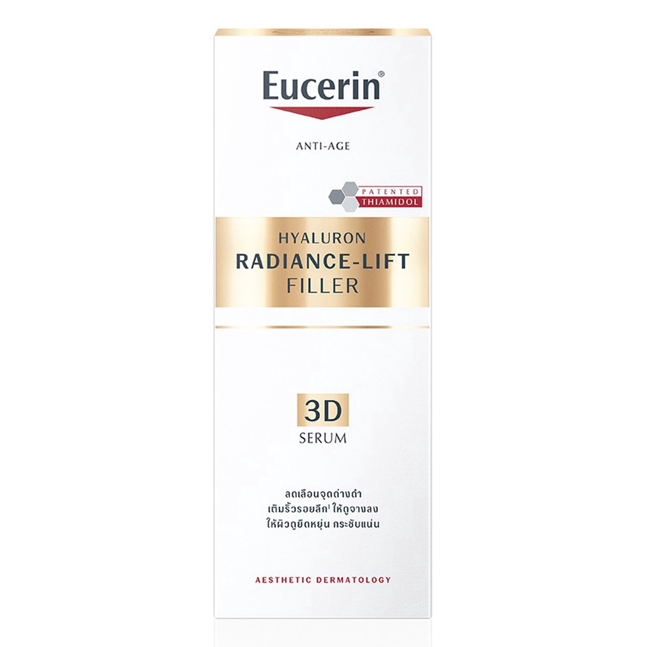 ยูเซอริน? ไฮยาลูรอน เรเดียนซ์-ลิฟต์ ฟิลเลอร์ ทรีดี เซรั่ม นวัตกรรมบำรุงผิวอ่อนเยาว์ 3มิติ 1.เติมริ้วรอยลึกให้ดูตื้นขึ้นด้วยไฮยาลูรอนโมเลกุลขนาดเล็กและเพิ่มความชุ่มชื้น และลดริ้วรอยตื้นด้วยไฮยาลูรอนโมเลกุลขนาดใหญ่ 2.ช่วยให้ผิวดูยืดหยุ่นด้วย Arctiin สารแอนตี้ออกซิแดนท์ทรงพลังที่ช่วยฟื้นบำรุงและกระชับผิว แม้ผิวหย่อนคล้อยมาก 3.ลดเลือนจุดด่างดำที่ฝังลึก ด้วย ThiamidoTM สารทรง ประสิทธิภาพในการ ลดรอยจุดด่างดำและลดโอกาสการกลับ มาเป็นซ้ำอีก ผิวดูกระจ่างใสอ่อนเยาว์ เห็นผลจริงใน 2 สัปดาห์ ผลลัพธ์ยาวนานเมื่อใช้อย่างต่อเนื่อง -ผิวดูเรียบเนียน ริ้วรอยดูลดเลือน -ผิวดูกระชับ และยืดหยุ่นขึ้น -สีผิวดูสม่ำเสมอ ดูกระจ่างใส จุดด่างดำดูลดลง -ผิวดูอ่อนเยาว์ -เติมความชุ่มชื้นให้กับผิว