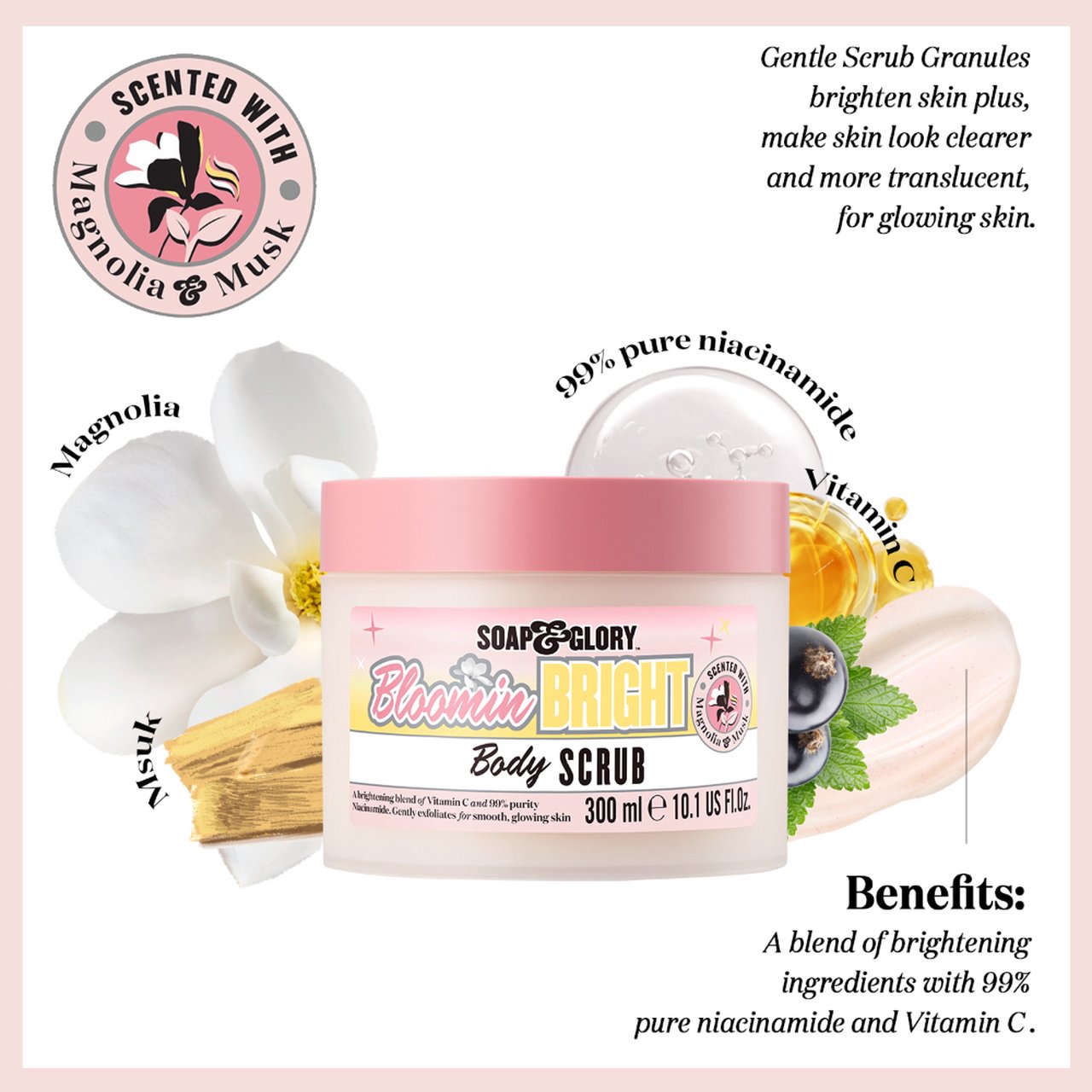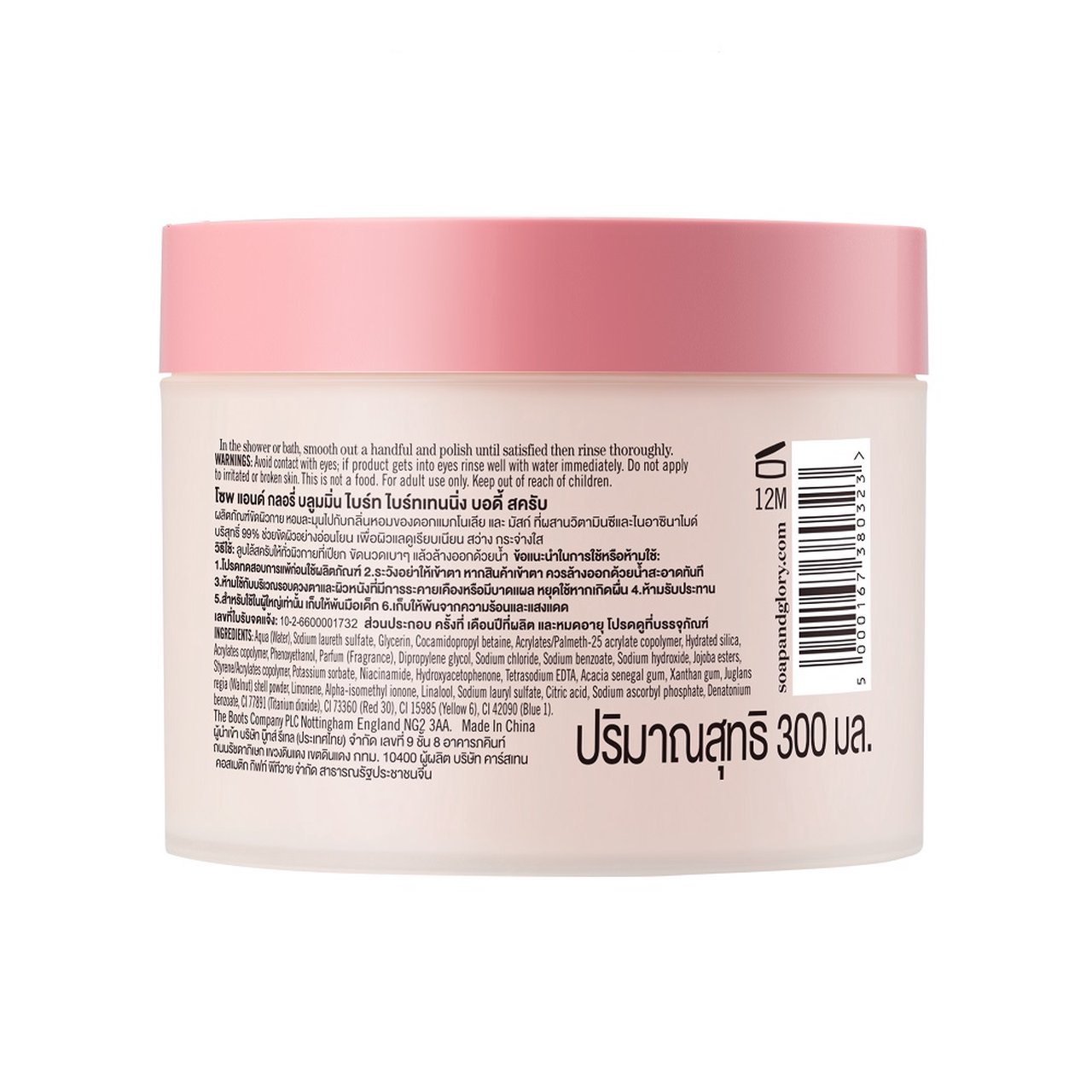 พร้อมสำหรับผิวที่โกล์วรึยัง นั้นคือบลูมมิ่น ไบร์ท ไบร์ทเทนนิ่ง บอดี้ สครับ สูตรที่ผสมผสานกันของความกระจ่างใสจาก วิตามินซี และ ไนอาซินนาไมด์บริสุทธิ์ 99%** ค่อยๆผลัดผิวคุณเพื่อเผยผิวที่โกล์ว เรียบเนียนดุจผ้าไหม สครับผลัดผิวตัวนี้มีกลิ่นวู้ดดี้และช่อดอกไม้ที่หรูหรา พร้อมด้วยกลิ่นโน๊ตของแคสซิสที่เย้ายวน และกลิ่นหอมเย้ายวนของดอกแม็กโนเลียที่เป็นหัวใจ ประสาทสัมผัสของคุณจะต้องตกหลุมรักกลิ่นนี้ คุณสมบัติและผลลัพธ์ที่ได้ - ผิวดูสว่างกระจ่างใสขึ้น และเรียบเนียนขึ้น - อุดมไปด้วย ไนอาซินาไมด์บริสุทธิ์ 99%** และ วิตามินซี - ผลัดเซลล์ผิวอย่างอ่อนโยนเพื่อผิวเนียนนุ่มดุจน้ำนม - อนุภาคขัดผิวที่เป็นธรรมชาติทั้งหมดและละเอียดอ่อน (ซิลิกาที่ให้ความชุ่มชื้น & ผงเปลือกวอลนัท - ผิวชุ่มชื้นหลังใช้ - เนื้อเบสเจลที่เป็นเอกลักษณ์ และ กลีเซอลีน ให้ความชุ่มชื้นผิวและทำให้ผิวเรียบเนียนในเวลาเดียวกัน - กลิ่นไม้แมกโนเลียหอมมีเสน่ห์ไร้เรียงสา กลิ่น บลูมมิ่น ไบร์ท ด้วยท๊อปโน๊ตของ แบล็คเคอร์แรนท์ และ เบอกาม็อท ทำให้เด็กสาวที่มีชีวิตชีวาและร่าเริง ด้วยลุคที่สดใสบริสุทธิ์ และเต็มไปด้วยพลัง กลิ่นแมกโนเลีย เป็นกลิ่นกลางปิดจบความสดชื่น กลิ่นกล้วยไม้หอมละมุนที่ค่อยๆระเหยมาเป็นบรรยากาศที่เย้ายวน กลิ่นมัสก์ที่อบอุ่นเป็นเบสไม่ได้สร้างความรู้สึกที่อบอุ่นและผ่อนคลาย เมื่อทุกกลิ่นเผยออกมา ความไร้เดียงสาของเด็กสาวเติบโตขึ้น เด็กสาวก็ไม่ใช่เด็กสาวอีกต่อไปแต่ก็ยังไม่ใช่ผู้หญิงเต็มตัว **ความบริสุทธิ์ของไนอาซินนาไมด์บริสุทธิ์ในสูตร วิธีใช้ ลูบไล้สครับให้ทั่วผิวกายที่เปียก ขัดนวดเบาๆ แล้วล้างออกด้วยน้ำ ข้อแนะนำในการใช้หรือห้ามใช้ โปรดทดสอบการแพ้ก่อนใช้ผลิตภัณฑ์ ระวังอย่าให้เข้าตา หากสินค้าเข้าตาควรล้างออกด้วยน้ำสะอาดทันที ห้ามใช้กับบริเวณรอบดวงตาและผิวหนังที่มีการระคายเคืองหรือมีบาดแผล หยุดใช้หากเกิดผื่น ห้ามรับประทาน สำหรับใช้ในผู้ใหญ่เท่านั้น เก็บให้พ้นมือเด็ก เก็บให้พ้นจากความร้อนและแสงแดด ส่วนประกอบ Aqua (Water), Sodium laureth sulfate, Glycerin, Cocamidopropyl betaine, Acrylates/Palmeth-25 acrylate copolymer, Hydrated silica, Acrylates copolymer, Phenoxyethanol, Parfum (Fragrance), Dipropylene glycol, Sodium chloride, Sodium benzoate, Sodium hydroxide, Jojoba esters, Styrene/Acrylates copolymer, Potassium sorbate, Niacinamide, Hydroxyacetophenone, Tetrasodium EDTA, Acacia senegal gum, Xanthan gum, Juglans regia (Walnut) shell powder, Limonene, Alpha-isomethyl ionone, Linalool, Sodium lauryl sulfate, Citric acid, Sodium ascorbyl phosphate, Denatonium benzoate, CI 77891 (Titanium dioxide), CI 73360 (Red 30), CI 15985 (Yellow 6), CI 42090 (Blue 1) *กรุณาอ้างอิงจากฉลากสินค้าจริง