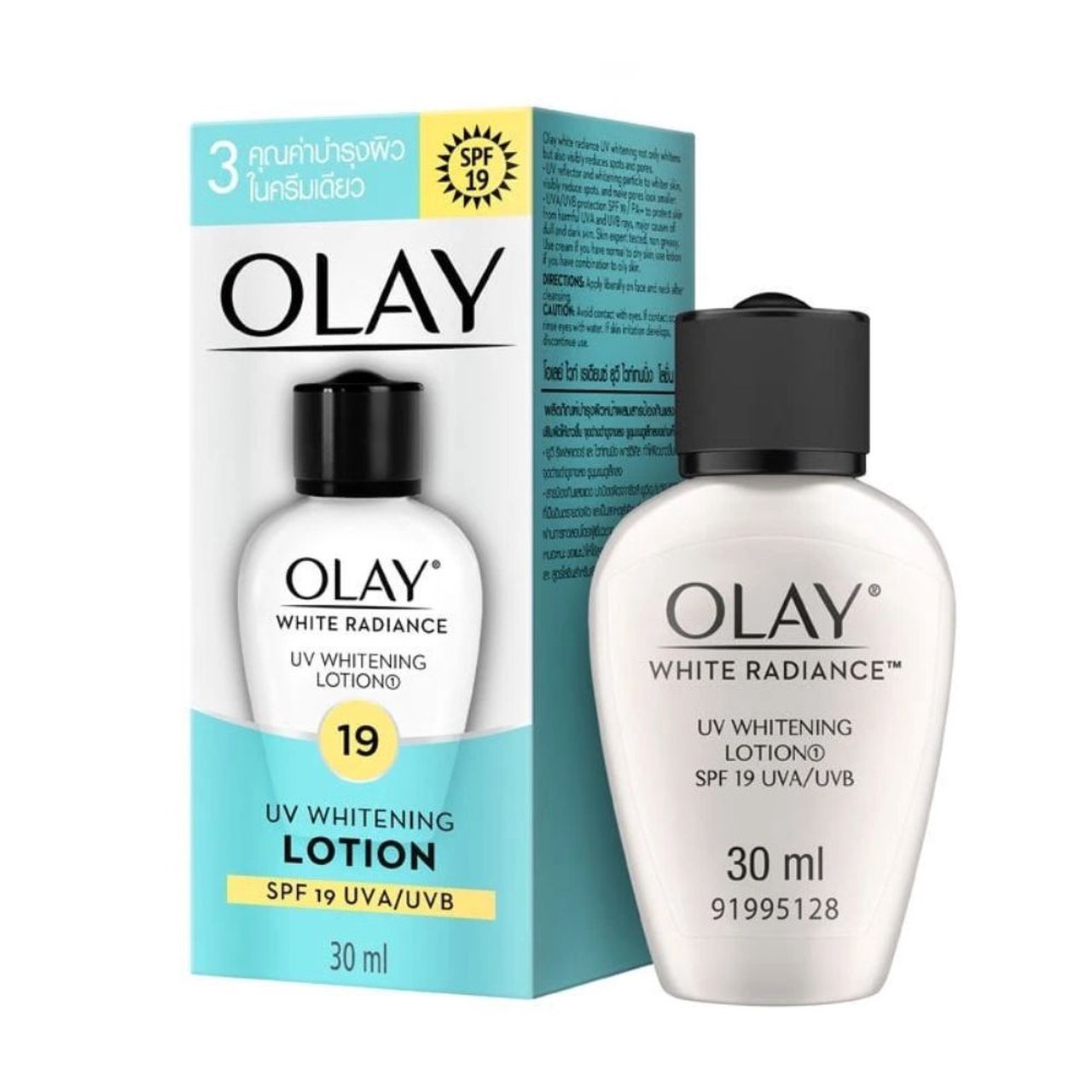 โอเลย์ ไวท์ เรเดียนซ์ ยูวี ไวท์เทนนิ่ง โลชั่น โลชั่นบำรุงผิวผสมสารป้องกันแสงแดด ปรับผิวให้ขาวขึ้น จุดด่างดำดูจางลง รูขุมขนดูเล็กลงอย่างเห็นได้ชัด - ยูวี รีเฟลคเตอร์ และ ไวท์เทนนิ่ง พาร์ติเคิล ทำให้ผิวขาวขึ้น จุดด่างดำดูจางลง รูขุมขนดูเล็กลง - สารป้องกันแสงแดด ปกป้องผิวจากรังสี ยูวีเอ/ยูวีบี (SPF 19) ที่เป็นอันตรายต่อผิว และเป็นสาเหตุสำคัญที่ทำให้ผิวหมองคล้ำ ผ่านการทดสอบโดยผู้เชี่ยวชาญด้านผิวหนัง สูตรไม่เหนียวเหนอะหนะ ขอแนะนำให้ใช้สูตรครีมสำหรับผิวธรรมดาถึงผิวแห้ง และ สูตรโลชั่นสำหรับผิวผสมถึงผิวมัน