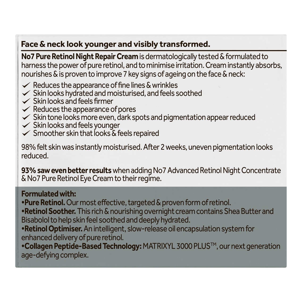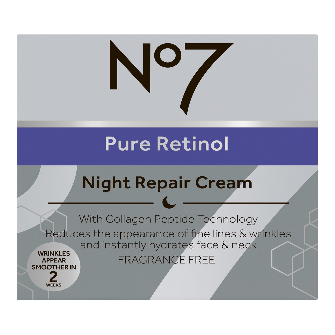 นัมเบอร์เซเว่น เพียว เรตินอล ไนท์ รีแพร์ ครีม 50มล. เปลี่ยนให้ผิวหน้าและคอให้ดูอ่อนเยาว์ลงด้วยนัมเบอร์เซเว่น เพียว เรตินอล ไนท์ รีแพร์ ครีม พิสูจน์แล้วว่าช่วยลดเลือนริ้วรอยอย่างมีประสิทธิภาพ สูตรที่นำเอาเรตินอลมาให้ให้เกิดผลลัพธ์มากที่สุดและลดการระคายผิว ให้ริ้วรอย ร่องต่างๆ และรูขุมขนดูลดเลือนลง เพื่อผิวที่รู้สึกอ่อนเยาว์ กระชับ อิ่มฟู แลดูเรียบเนียน ผสานส่วนผสมของ - Pure Retinol เรตินอลทรงประสิทธิภาพ ช่วยจัดการริ้วรอยแห่งวัยได้ตรงจุด - Retinol Soother เข้มข้นด้วย เชีย บัทเทอร์ และ Bisabolol ช่วยให้ผิวรู้สึกได้รับการปลอบประโลม และดูอิ่มน้ำอย่างล้ำลึก^ - Retinol Optimiser: ช่วยผลักเรตินอลให้ซึมเข้าสู่ผิวอย่างช้าๆ เพื่อเพิ่มประสิทธิภาพในการทำงานของเรตินอล - เทคโนโลยีจากคอลลาเจน เปปไทด์ MATRIXYL 3000 PLUS?: ส่วนผสมจากคอลลาเจนรูปแบบใหม่ ที่ช่วยในการลดเลือนริ้วรอย คุณสมบัติและผลลัพธ์ที่ได้: - ริ้วรอย ความหย่อนคล้อย ดูลดเลือนใน 2 สัปดาห์* - พิสูจน์แล้วว่าช่วยลดเลือนสัญญาณแห่งวัยทั้ง 7 ประการ (ริ้วรอย จุดด่างดำ ผิวแห้ง โทนผิวไม่สม่ำเสมอ ความหย่อนคล้อย ขาดความกระชับ และไม่เรียบเนียน) - ผิวหน้าและบริเวณคอ รู้สึกได้รับการฟื้นฟู ดูเรียบเนียน - ด้วยคอลลาเจน เปปไทด์ เทคโนโลยี - รับรองโดยผู้เชี่ยวชาญด้านผิวหนัง - ปราศจากน้ำหอม ผู้ทดลองใช้บอกเป็นเสียงเดียวกันว่าเห็นผลจริง* 98% รู้สึกว่าผิวรู้สึกชุ่มชื้นทันทีที่ใช้ 93% เห็นผลลัพธ์ดียิ่งขึ้นเมื่อใช้คู่กับ No7 Advanced Retinol Night Concentrate และ No7 Pure Retinol Eye Cream ^ผิวชั้นนอก *ผลทดสอบความพึงพอใจในอาสาสมัครอย่างน้อย 52 คน โดย บู๊ทส์ สหราชอาณาจักร ปี พ.ศ. 2564 ผลลัพธ์ที่ได้ขึ้นกับสภาพผิวแต่ละบุคคล และเมื่อใช้เป็นประจำอย่างต่อเนื่อง วิธีใช้: ใช้เป็นประจำทุกเย็น ทาครีมให้ทั่วใบหน้าและลำคอจนครีมซึมซาบเข้าสู่ผิว ข้อแนะนำในการใช้หรือห้ามใช้ ผลิตภัณฑ์มีส่วนผสมของเรตินอลซึ่งอาจทำให้ผิวระคายเคือง กรุณาอ่านคำแนะนำในการใช้และคำเตือนให้ละเอียดก่อนใช้ครั้งแรก และเก็บแผ่นพับไว้ ผู้ที่ตั้งครรภ์และให้นมบุตรไม่ควรใช้ผลิตภัณฑ์ที่มีส่วนผสมกลุ่มเรตินอยด์ - งดใช้ในผิวที่มีการระคายเคือง ผิวแตก และผิวไหม้ - เรตินอลอาจทำให้ผิวไวต่อแสงแดด ให้หลีกเลี่ยงแสงแดดและทาผลิตภัณฑ์ที่มีส่วนผสมของสารกันแดด อย่างน้อย SPF 15 ทุกเช้า ส่วนประกอบ: Aqua (Water), Glycerin, Butylene glycol, Dimethicone, Caprylic/capric triglyceride, C12-15 alkyl benzoate, Phenoxyethanol, Polysorbate 20, Xanthan gum, Acrylates/C10-30 alkyl acrylate crosspolymer, Dimethiconol, Retinol, Bisabolol, Inulin lauryl carbamate, Caprylyl glycol, Sorbitan laurate, Potassium hydroxide, Ethylhexylglycerin, Carbomer, Tetrasodium EDTA, Behentrimonium chloride, Sucrose laurate, Hydroxyethylcellulose, Acetyl dipeptide-1 cetyl ester, Benzoic acid, Palmitoyl tripeptide-1, Palmitoyl tetrapeptide-7 *กรุณาอ้างอิงจากฉลากสินค้าจริง